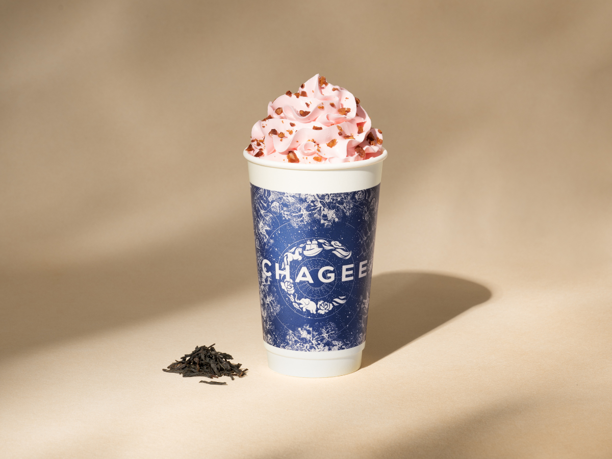 Indulge in a refreshing cup of chilled Da Hong Pao paired with fragrant white peach fresh cream and topped with freeze-dried fig bits.